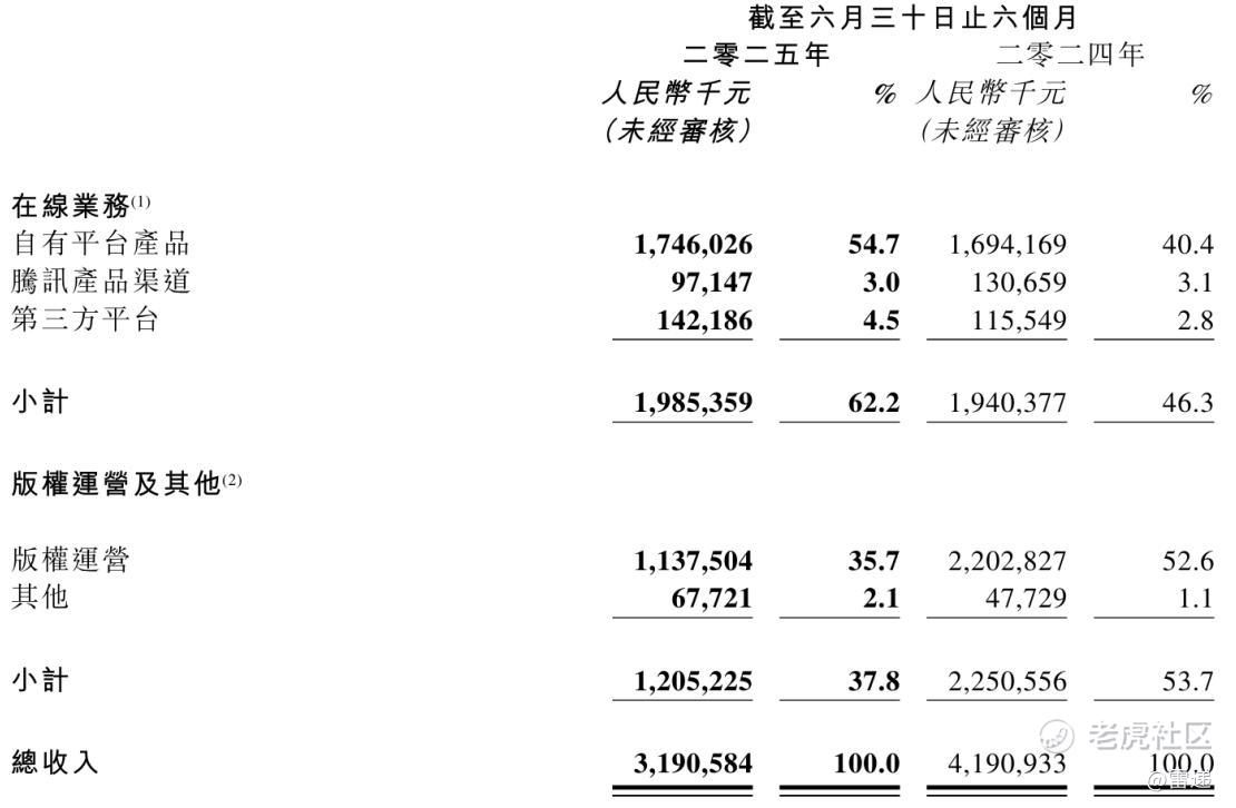 其中,阅文集团2025年上半年来自自有平台产品的收入为17.46亿元,较上年同期的16.94亿元增长3%;阅文集团自有平台产品的收入占总营收的比例为54.7%,较上年同期的40.4%提升14.3个百分点。