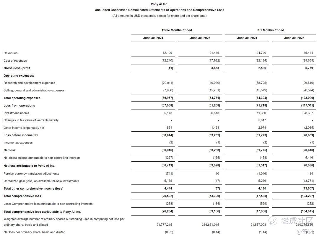 自动驾驶公司小马智行(NASDAQ: PONY)今日披露未经审计的2025年第二季度财报,财报显示,小马智行2025年上半年营收为3543万美元,较上年同期的2472万美元增长43.3%;净亏损为9064万美元,上年同期的净亏损为5176万美元。