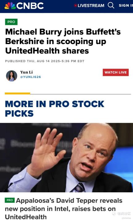 无独有偶,另外一个新闻也报道了伯克希尔哈撒韦(巴菲特)和 Scion Asset Management(迈克尔·伯里)都在买入 UNH, 迈克尔·伯里持有 350,000 股的看涨期权(Call Options),名义价值超过 1.09 亿美元。。还有Appaloosa(大卫·泰珀)也在加码 UNH。这么看来,联合健康集团(UNH)已经成为明星投资者的共同选择了。