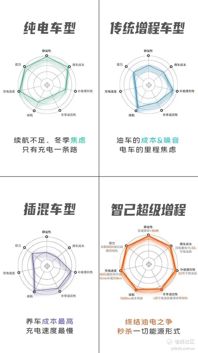 三种新能源形式与智己超级增程在动力、静谧性、用车成本等 7 个维度的表现。