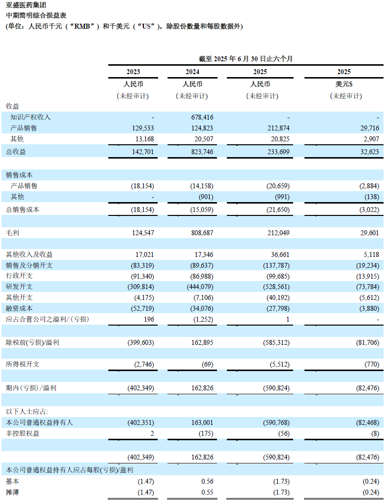 亚盛医药的收入由截至2024年6月30日止六个月的8.24亿元人民币减少5.90亿元人民币或71.6%至截至2025年6月30日止六个月的2.34亿元人民币。收入下降主要由于我们在截至2024年6月30日止六个月期间记入了金额为6.78亿元人民币的知识产权收入。耐立克®2025年上半年在中国市场的销售收入由截至2024年6月30日的六个月的1.13亿元人民币增长1.04亿元人民币或92.5%至2.17亿元人民币。