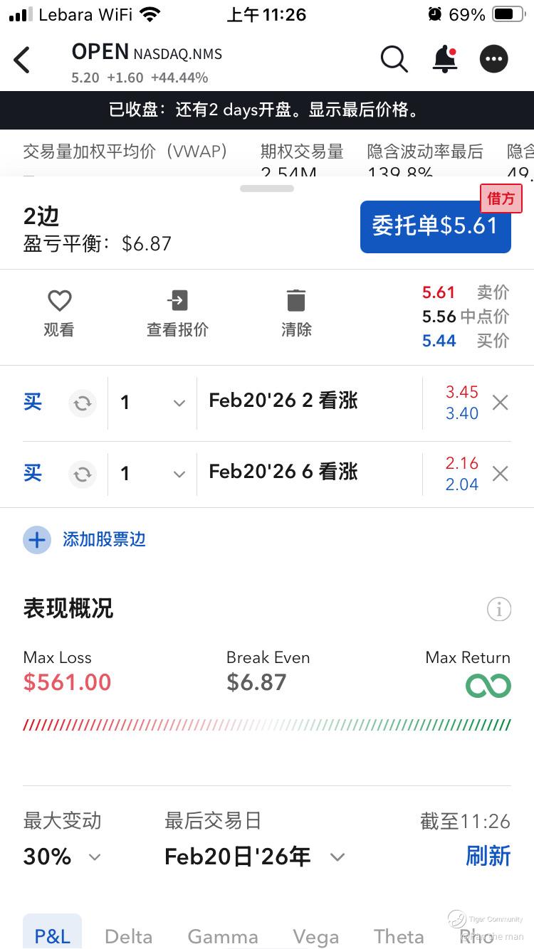 买入 2 月 20 日 ’26 到期的 $2 看涨期权 和 $6 看涨期权,组合成本 561 美元。
