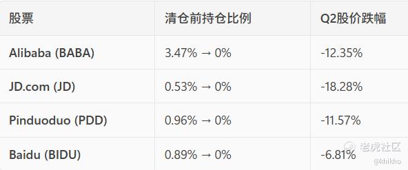 然后我想知道他们减持了什么,如果我恰好也持有这些他们清仓掉得股票,虽然我不知道为什么他减持或清仓,但我仍然打算跟着清掉,减少自己的风险。桥水在Q2卖掉了下面这些中国科技股,阿里巴巴,京东,拼多多,还有百度,这些股票在Q1曾因AI题材被“重估”,但Q2表现不佳,桥水做到了精准撤出。