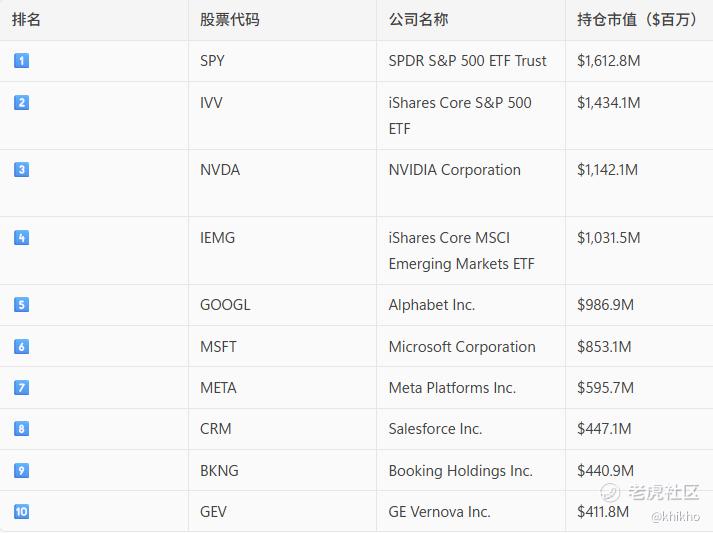 当然,我也想知道他们的最新重仓股都有哪些,我觉得这些股票应该就是大厂机构看好的,可以跟着买的。根据桥水基金(Bridgewater Associates LP)2025年第二季度最新13F报告,其前十大持仓如下,展现出其对ETF与科技股的高度偏好。 $标普500ETF(SPY)$ 是他们的第一大持仓, $标普500指数ETF(IVV)$ 占据他们的第一大仓位,稳得一匹,我很喜欢这个风格。