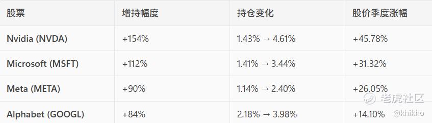 我最先想知道他们这个季度加了些什么,因为这代表这个大厂看好。桥水在Q2大幅加码了美国“AI七巨头”中的四家, $英伟达(NVDA)$ $微软(MSFT)$ $Meta Platforms, Inc.(META)$ 还有谷歌, 这些股票的上涨主要受益于AI需求强劲、市场对关税担忧缓解等因素。