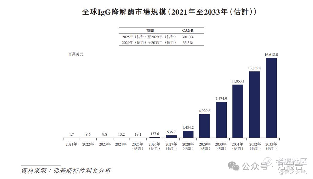 IgG降解酶已被探索在治疗多种罕见急性自身免疫性疾病(包括抗肾小球基底膜 病(抗GBM病)、吉兰-巴雷综合症(GBS)及其他自身免疫性疾病)方面的潜力,其通过降解病理性IgG抗体,可以减轻抗体介导的组织损伤和疾病严重性。全球IgG降解酶市场势将迎来显著增长,市场规模由2021年的1.7百万美元增加至2024年的13.2百万美元,预期于2025年的价值将达到19.1百万美元及于2029年的价值达到4,929.6百万美元,再于2033年达到16,618.0百万美元,2025年至2029年预测CAGR为301.0%,2029年至2033年CAGR为35.3%。同时,预期中国IgG降解酶市场稍后出现增长势头,预期2029年至2033年以47.8%的强劲CAGR增长,由2029年的人民币1,338.9百万元增加至2033年的人民币6,386.1百万元。