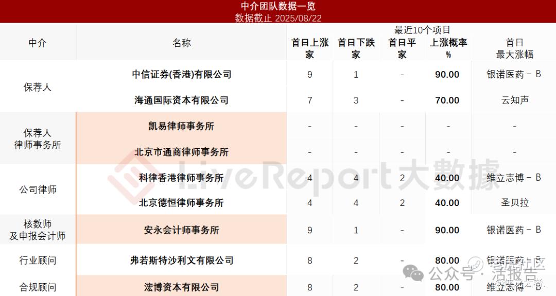据**大数据统计,宝济药业中介团队共计9家,其中保荐人2家,近10家保荐项目数据表现较出彩;公司律师共计2家,综合项目数据不尽如意。整体而言中介团队历史数据表现尚可。