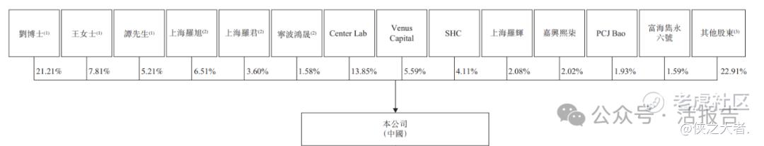 另有股东Center Lab持股约13.85%;Venus Capital持股约5.59%;SHC 持股约4.11%;上海罗辉持股约2.08%;嘉兴熙柒持股约2.02%; PCJ Bao持股约1.93%;富海隽永六号持股约1.59%及上市前其他股东持股约22.91%。