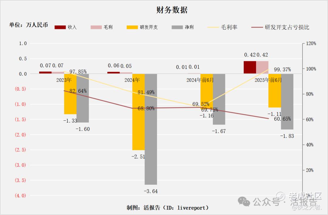 该图表展示了公司2023年、2024年及2024 - 2025年前6月的财务数据:整体呈现收入、毛利增长但净利仍为负,毛利率和研发开支占亏损比有波动的情况。