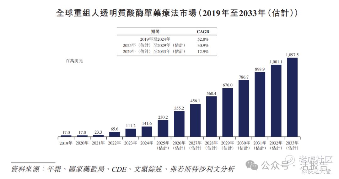 根据弗若斯特沙利文(Frost & Sullivan)的资料,全球重组人透明质酸酶单药疗法市场由2019年的17.0百万美元增加至2024年的141.6百万美元,CAGR为52.8%,预计到2025年将达到230.2百万美元及到2029年将达到676.0百万美元,2025年至2029年的CAGR为30.9%,并于2033年达到1,097.5百万美元,2029年至2033年的CAGR为12.9%。在中国,在2025年下半年获得KJ017的NDA批准后,预计重组人透明质酸酶单药疗法市场于2026年兴起,市场规模为人民币124.8百万元,并于2029年迅速增长至人民币948.6百万元,2026年至2029年的CAGR为96.6%,并预计于2033年将达到人民币1,506.9百万美元,2029年至2033年的CAGR为12.3%。