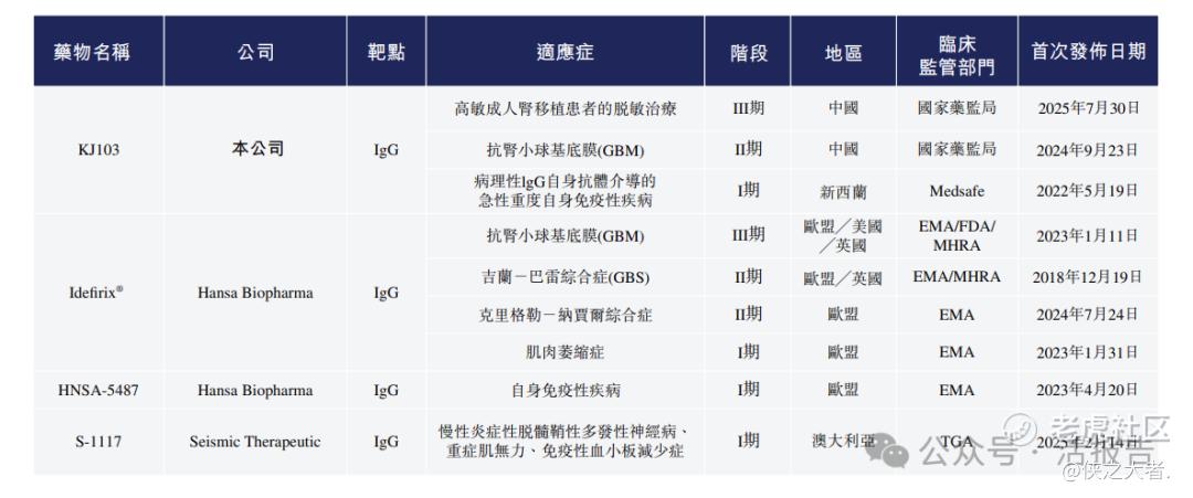 截至最后实际可行日期,全球有四种IgG降解酶候选产品正处于临床开发阶段, 其中包括已进入III期临床试验的KJ103及Idefirix®:KJ103针对肾脏移植前脱敏, Idefirix®针对抗GBM病。此外,HNSA-5487及S-1117目前处于I期阶段。值得注意的是,Idefirix®已获批用于肾脏移植前脱敏,并在欧洲上市,截至最后实际可行日期仍为全球唯一的上市产品。公司的KJ103在肾脏移植排斥反应方面处于III期、在抗GBM病方面处于II期,并于2025年4月获得国家药监局对GBS的IND批准,并无其他IgG降解酶产品处于临床阶段或在中国获得批准。