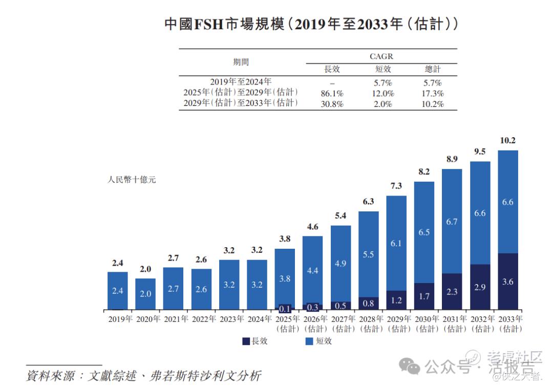 在中国,FSH市场由2019年的人民币24亿元增加到2024年的人民币32亿元, CAGR为5.7%,并预计于2025年达到人民币38亿元,于2029年达到人民币73亿元及于2033年再达到人民币102亿元,2025年至2029年的预测CAGR为17.3%,2029年至2033年的CAGR为10.2%。长效FSH因其复杂技术要求而将上市时间推迟到2025年。