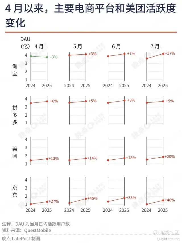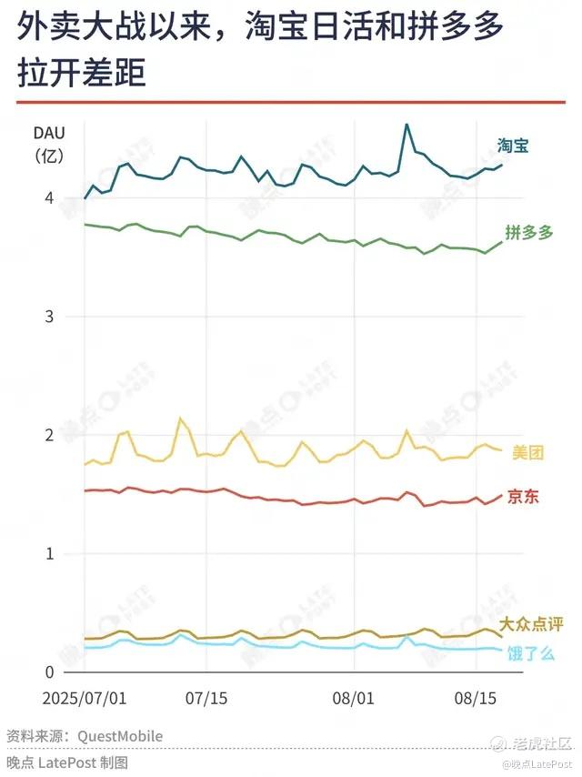 8 月 8 日立秋后,淘宝闪购订单量首次超过 $美团-W(03690)$ 。更显著的影响可能是,巨额补贴让淘宝吸引到了很多用户注意力,7 月以来淘宝在日均活跃用户数(DAU)上拉开了和拼多多的差距。