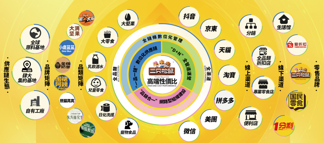 三只松鼠,成立于2012年,作为中资休闲零食企业,以线上业务起步,是中国互联网时代诞生的“全品类+全渠道”经营模式的创新者与代表者,产品组合面向各类消费者,包括坚果、烘焙食品、综合零食、肉制品和果干等。