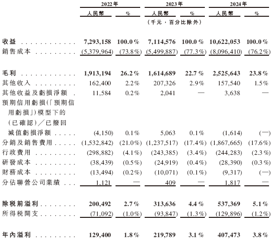 招股书显示,在过去的2022年、2023年、2024年,三只松鼠的营业收入分别人民币72.93亿、71.15亿和106.22亿元,相应的净利润分别为人民币1.29亿、2.20亿和4.07亿元。