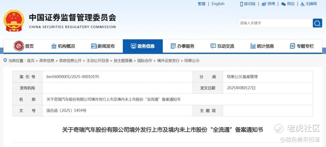 中国证监会网站发布关于奇瑞汽车股份有限公司境外发行上市及境内未上市股份“全流通”备案通知书。奇瑞汽车将计划发行不超过698,922,800股境外上市普通股并在香港交易所上市。