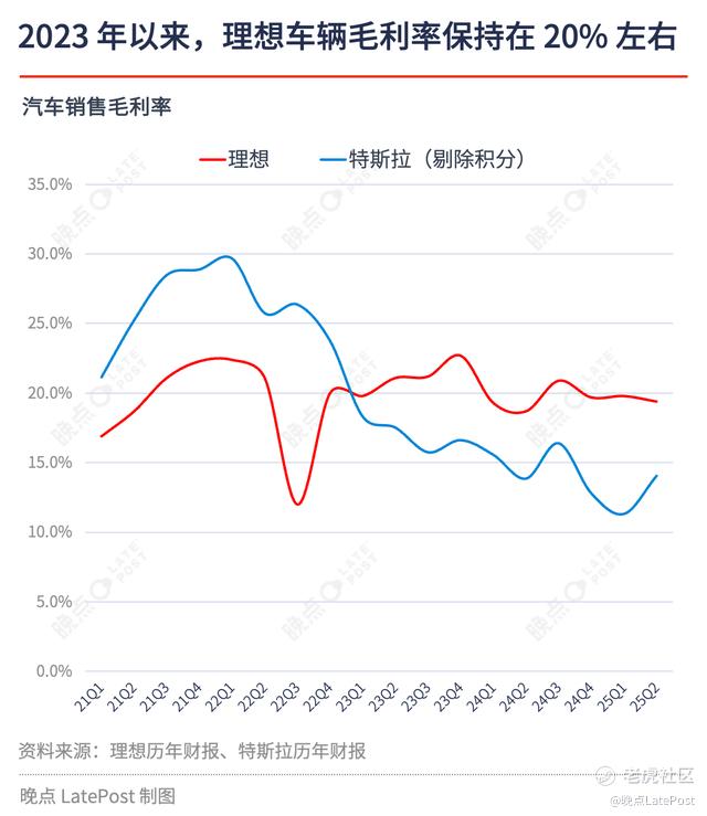 今年 4 至 6 月,理想共交付新车 11.1 万辆,同比增长 2.3%。与此对应的汽车销售收入为 288.9 亿元,同比下滑 4.7%。尽管收入承压,但财报中的一个积极信号是,车辆毛利率依然保持在 19.4% 的健康水平,且同比提升 0.7 个百分点,并预计三季度仍能维持在 19% 左右。这说明理想依然具备较好的成本控制能力。