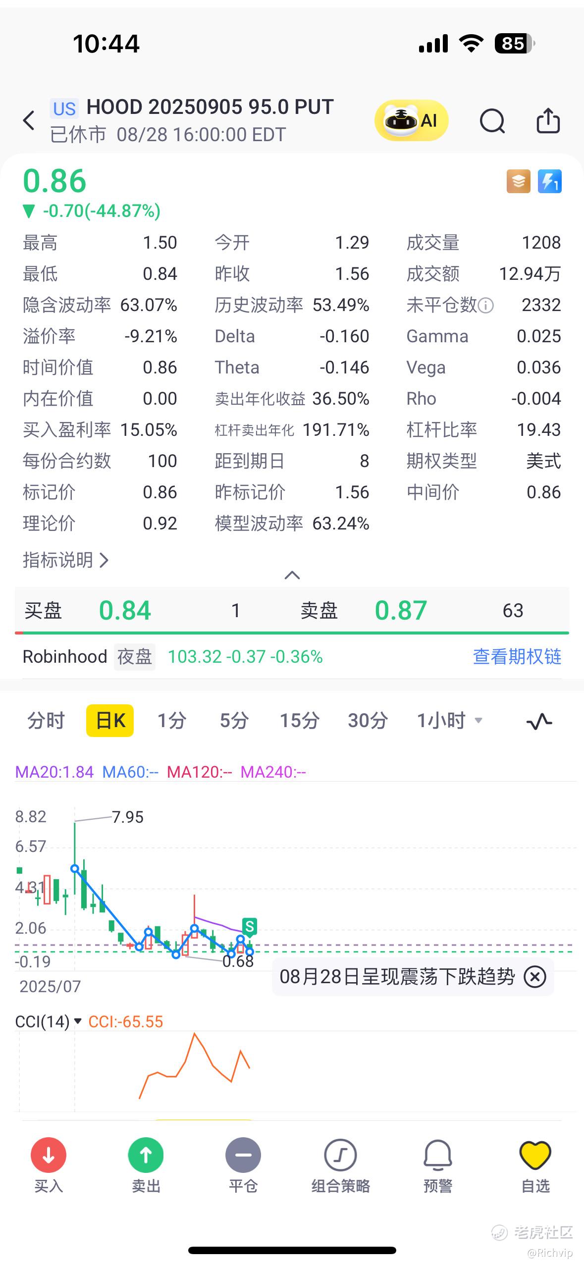 目前正股HOOD价格在104$处,考虑到行权日期较近,所以选择95$。