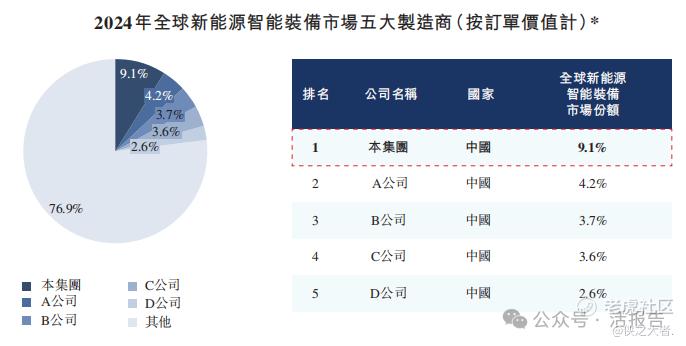 按订单价值计,2024年公司为全球市场最大新能源智能装备制造商,市场份额为9.1%。于2024年,全球新能源智能装备市场的五大参与者(按订单价值计)的市场份额合共为23.1%。