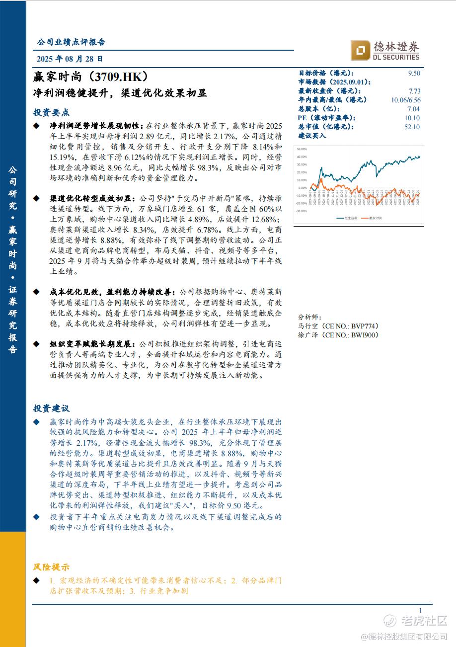 赢家时尚作为中高端女装龙头企业,在行业整体承压环境下展现出较强的抗风险能力和转型决心。公司 2025 年上半年归母净利润逆势增长 2.17%,经营性现金流大幅增长 98.3%,充分体现了管理层的经营能力。渠道转型成效初显,电商渠道增长 8.88%,购物中心和奥特莱斯等优质渠道占比提升且店效改善明显。随着 9 月与天猫合作超级时装周等重要营销活动的推进,以及抖音、视频号等新兴渠道的深度布局,下半年线上业绩有望进一步提升。