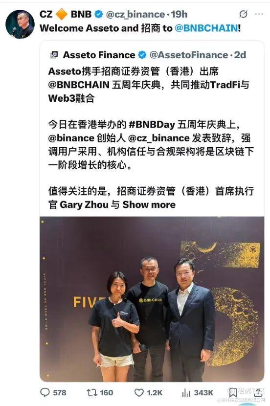 图1:赵长鹏在其社交媒体平台转发并欢迎Asseto Finance与招商证券资管(香港)加入BNB Chain生态