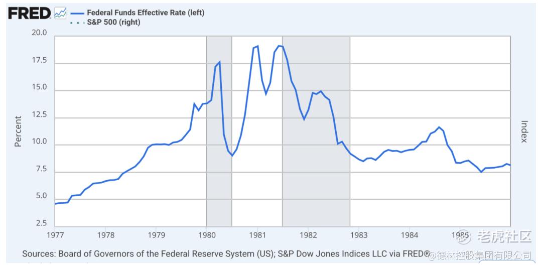 1979年沃尔克就任美联储主席后采用雷霆手段,把联邦利率加到20%。加息给经济带来的痛苦是显而易见的,美国失业率在1983年触顶10.8%,30年抵押贷款利率高达18.45%,3年个人存单利率也飙至18.65%,股市低迷。