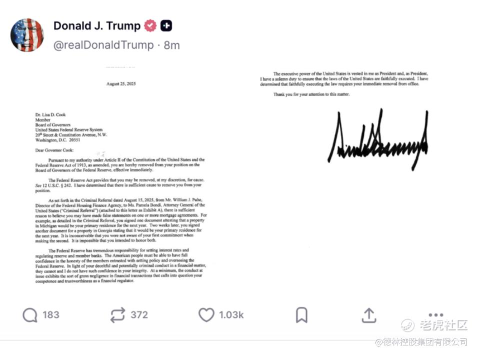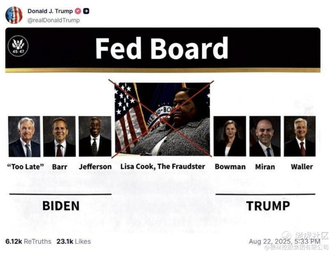 鲍威尔不听命于特朗普已经是很明确的事实了。2025年8月25日特朗普宣布解除美联储理事库克的职务——立即生效,这在美联储历史上属于首次。特朗普称库克在金融事务中存在“欺诈性和潜在犯罪性行为”, 具体内容是在抵押贷款文件中作出虚假陈述,将两处物业都称为主要住所。特朗普认为此举已动摇其作为监管者的可信度。