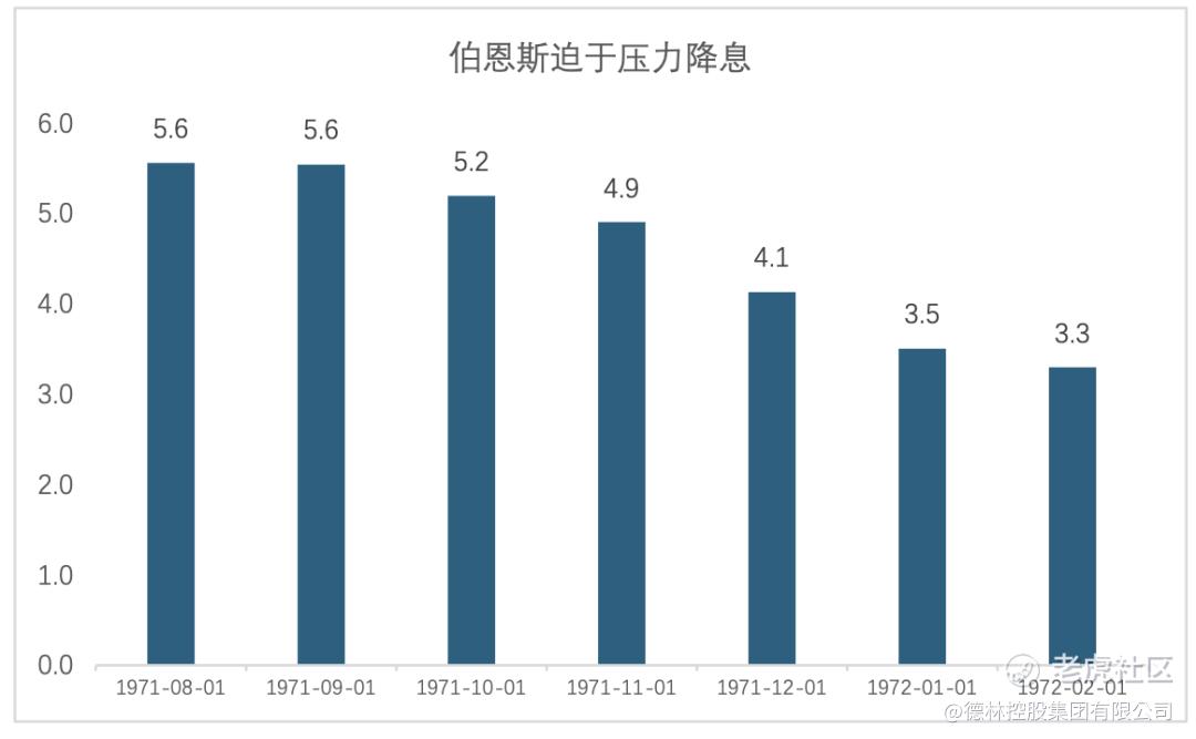 1971年美国陷入滞胀,失业率高达6.1%,通胀突破5.8%,这样的大背景下尼克松谋求连任。为应对1972年的大选,尼克松希望有宽松的货币政策刺激经济,制造繁荣。白宫录音记录显示,尼克松与伯恩斯1971年第三季度和第四季度正式会面达到34次,尼克松甚至直接训斥伯恩斯关于流动性过剩的观点是Bullshit,要求其降息。伯恩斯最终妥协!标普500指数从90上涨到120,尼克松也成功连任。