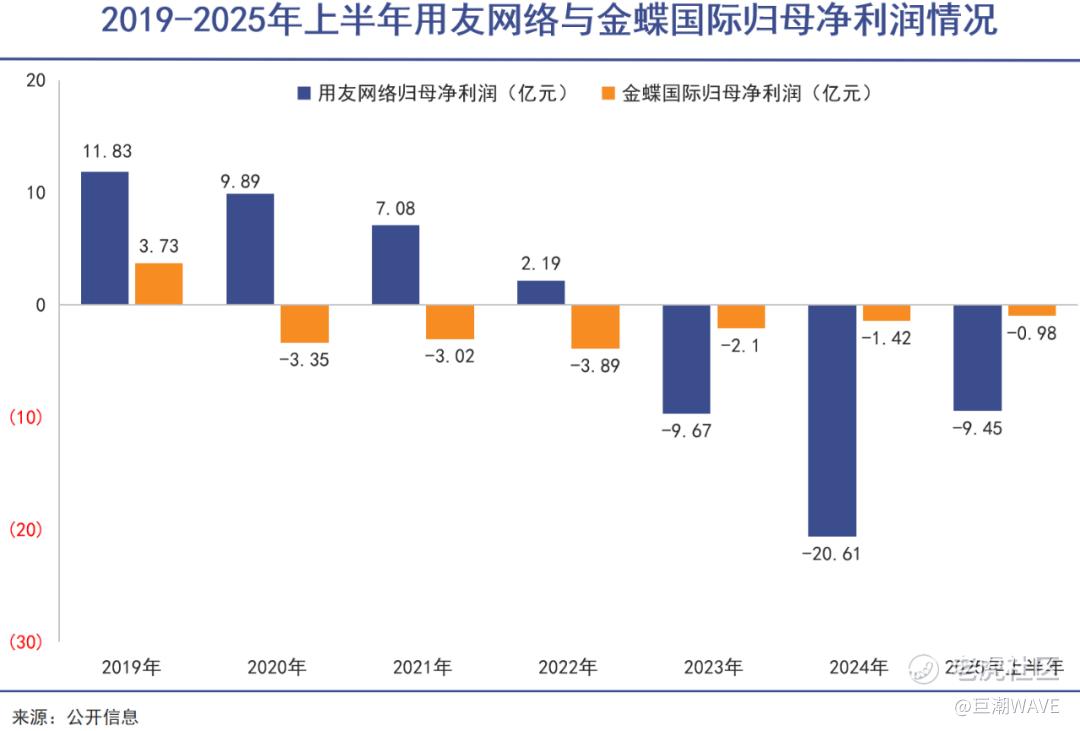 用友的情况也是类似。虽然其亏损年度数量比较少,但去年一年亏损了20亿元以上。加上今年上半年亏损的9.45亿元,两年半下来亏损金额将近40亿元。