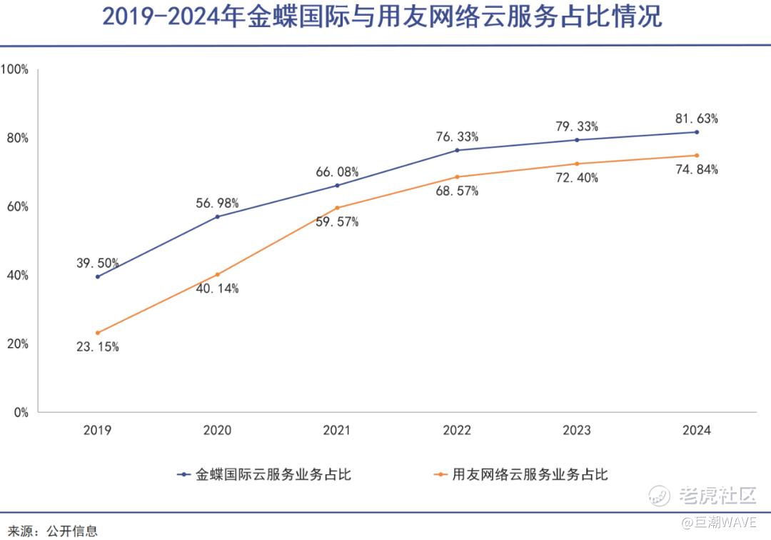 从效果来看,这样的转型确实迎合了市场需求。近五年来,用友和金蝶的云服务在其业务构成中,逐渐占据了主角的地位。其中,金蝶国际从不足四成比重飙升至超过八成,而用友网络也从两成多激增至超过七成。