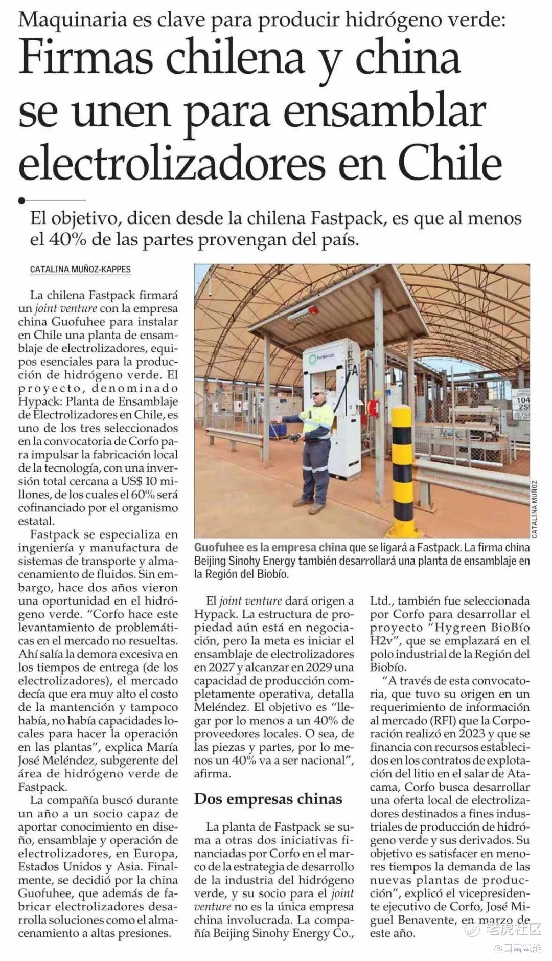 此前,国富氢能与 Fastpack 合作的电解槽制造基地项目已入选智利生产促进局(Corfo)“电解槽及组件本地化制造计划” 补助名单,获600万美元政府基金支持,纳入智利12.8GW 绿氢超级工程规划体系;此次签约合资,标志着项目从政策资金落地阶段正式迈入电解槽本地化基地的实质建设阶段,即将启动碱性与PEM电解槽组装线及纯化系统的本土产线筹建,加速从核心技术输出到全链条本地化的落地进程。