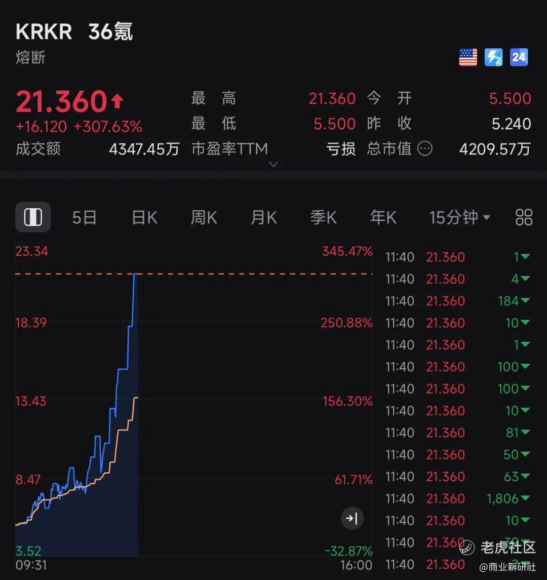 今天凌晨,中概股36氪一夜多次触发临时熔断,股价涨幅扩大到308%,最高达21.36美元/股,最终报收10.1美元/股,涨幅92.75%,市值涨到接近2000万美元。根据公告,36氪昨天确实有召开特别股东大会,以考虑重大企业行动,而按照以往操作,此类事件可能涉及重大资本运作,比如并购事宜或战略投资之类的,之前股吧就有人爆料,称财新有可能收购借壳,但无任何官方证实