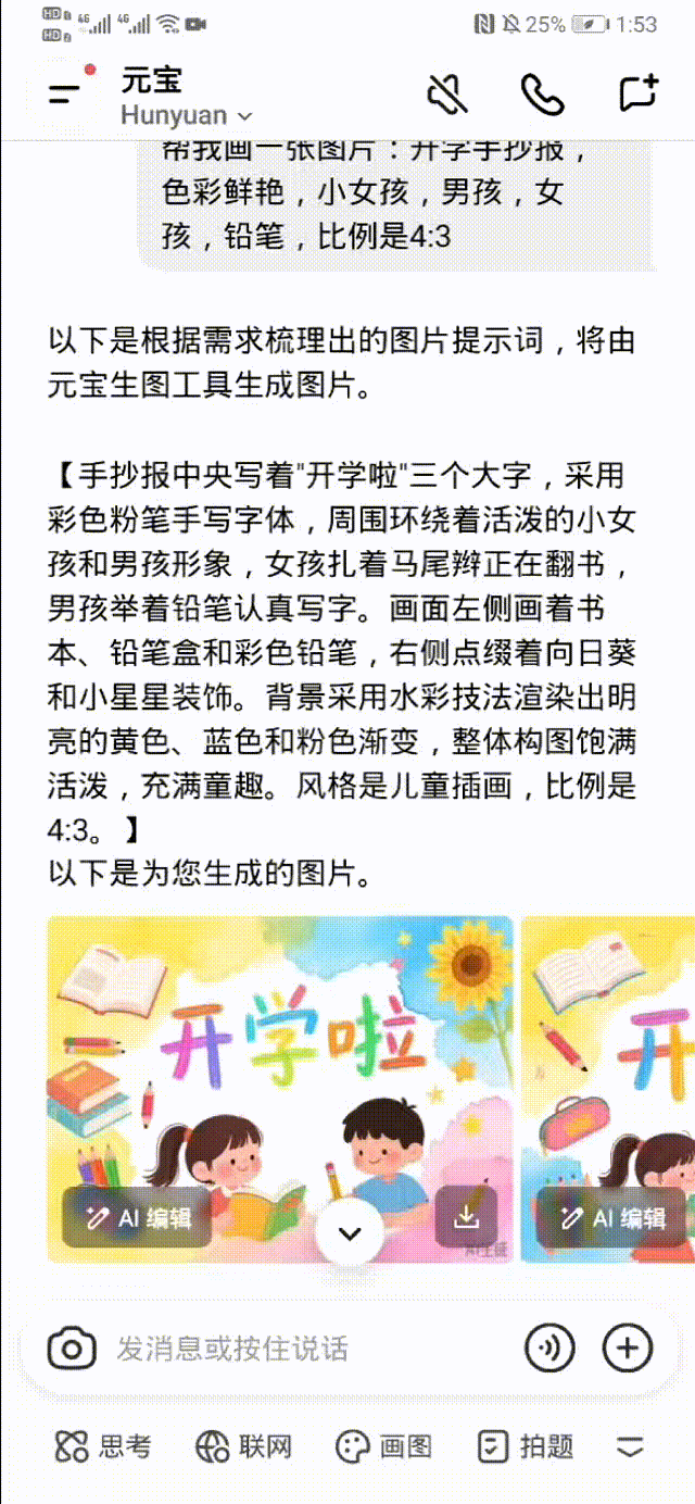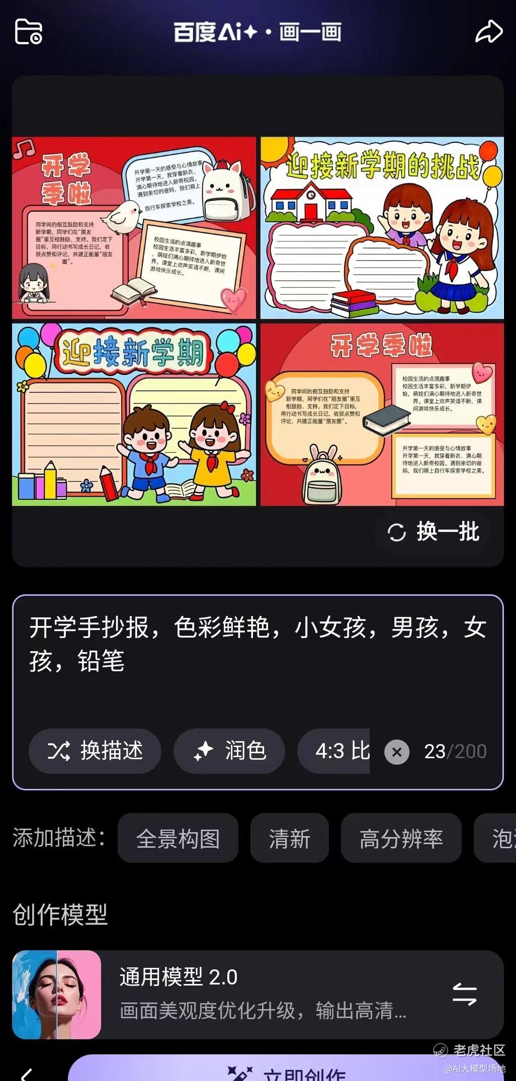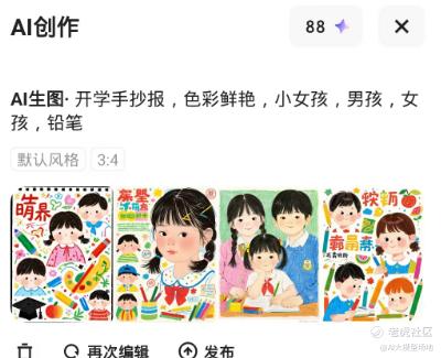 最后我们来看一下AI生图吧。可以选择比例,然后输入要求:开学手抄报,色彩鲜艳,小女孩,男孩,女孩,铅笔。