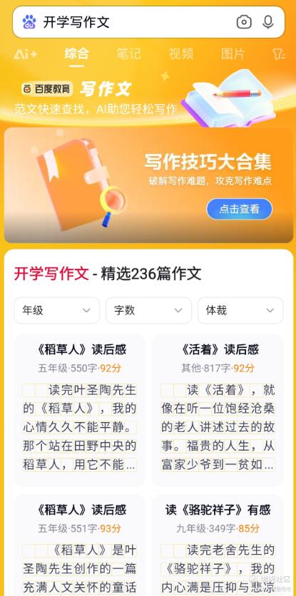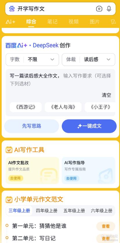 下方也有专门写作文的地方,点进去可以看到可以进行选择年级,体裁,字数有海量作文进行参考,下方的deep seek创作可以写思路,很全面,不过如果不太了解的同学可能只点上方的快捷工具,就把全部的功能给错过了,渠道有些繁琐。