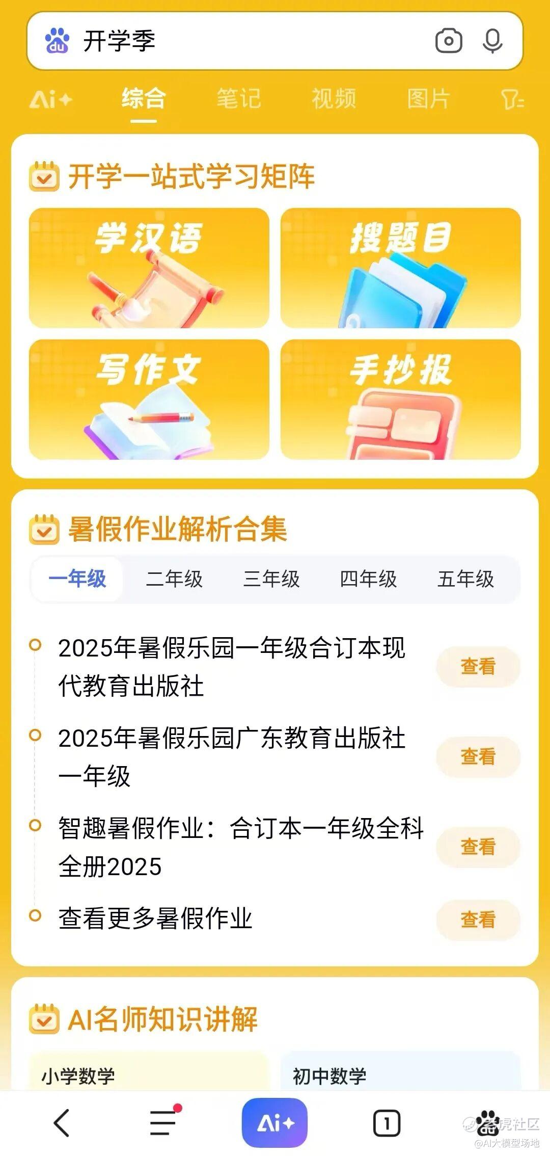 这次在百度APP上搜索开学季就可以弹出一个专门查询的界面,百度已经给罗列好了AI工具,不论是从预习到解题,还是从数学到写作,那叫一个全,这是要成为全能助手的节奏。