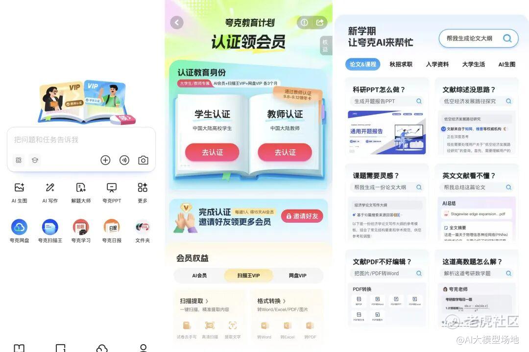 再来看看夸克搜索,夸克在界面上有一个认证身份可以免费领会员的福利,会员可以使用更多的AI功能,大家不要忘记去领取哦~当然普通用户可以使用的AI功能也不少 ,AI生图、AI写作、解题大师、夸克PPT,都可以满足基本上的学习需求。