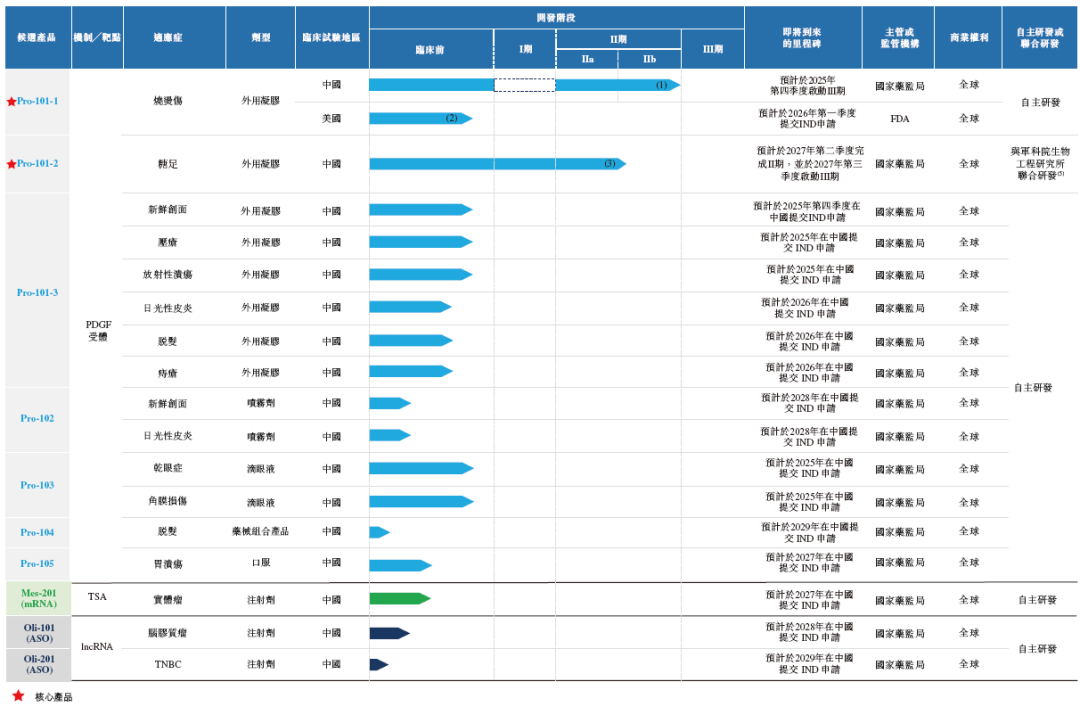 Pro-101-1,是中国治疗烧烫伤临床开发进度最快的PDGF候选药物,有望成为中国首款用于该适应症的商业化的PDGF产品。Pro- 101-1已在中国完成IIb期临床试验,并正处于确定临床试验报告的阶段,预期将于2025年第三季度完成,拟于2025年第四季度启动III期临床试验,并于2026年第四季度完成试验,计划于2027年在中国推出该产品。华芢生物亦于2021年12月就Pro-101-1治疗烧烫伤向FDA提交了IND前沟通申请,FDA同意公司开展临床试验的建议及通过创新生物制剂审批途径提交Pro-101-1治疗烧烫伤的BLA。公司预期将于2026年第一季度向FDA提交IND申请。