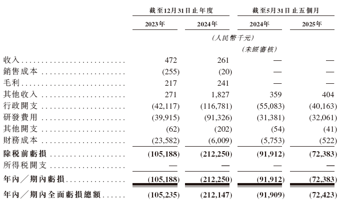 招股书显示,在过去的2023年、2024年和2025年前五个月,华芢生物的收入分别为人民币47.2万、26.1万和0元;相应期间的研发开支分别为人民币3991.5万、9132.6万和3206.1万元;相应期间的净亏损分别为人民币1.05亿、2.12亿和0.72亿元。