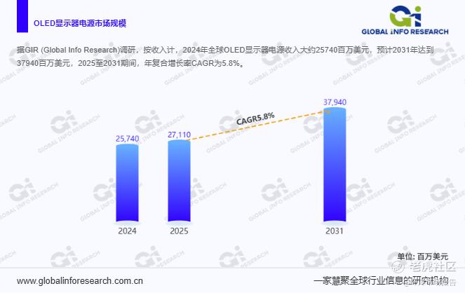 据 Global Info Research(环洋市场咨询)调研数据显示,从收入维度来看,2024 年全球 OLED 显示器电源市场收入约为 25740 百万美元。随着 OLED 显示屏在智能手机、电视、汽车等领域的渗透率持续提升,市场对配套电源的需求稳步增长,预计到 2031 年,市场收入将攀升至 37940 百万美元,在 2025 至 2031 年期间,年复合增长率(CAGR)稳定保持在 5.8%,市场整体呈现规模大、增长稳的良好态势。