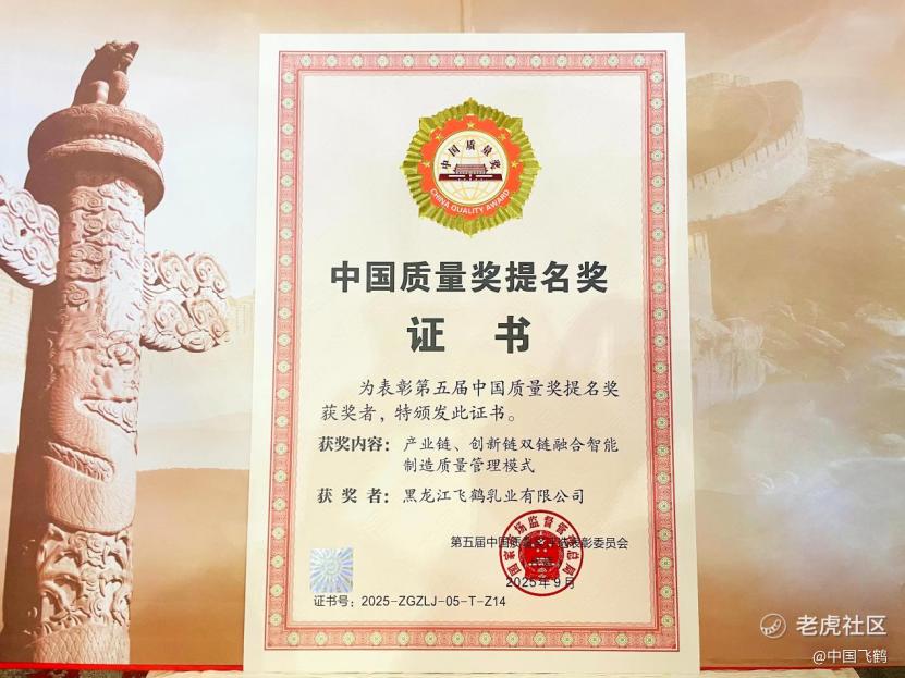 9月16日,第五届中国质量奖获奖名单正式公布,中国飞鹤乳业凭借“产业链、创新链双链融合智能制造质量管理模式”荣获第五届中国质量奖提名奖,成为婴幼儿奶粉行业中唯一获此殊荣的企业。这一荣誉不仅是对飞鹤63年来坚守质量初心的高度认可,更是中国乳业质量管理水平迈向新台阶的重要标志。
