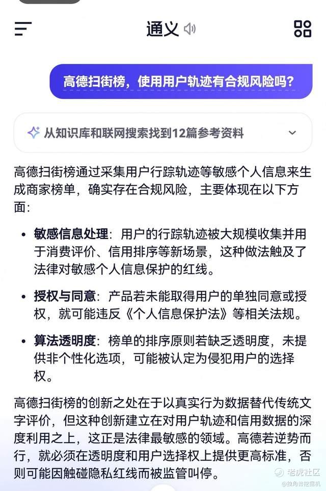 当然,个人观点,难免有失偏颇,所以,挖哥也把“高德扫街榜,使用用户轨迹有合规风险吗?”这个问题抛给了更有智慧的大模型,为公平起见,挖哥选择了阿里旗下的通义千问大模型,得到了如下答复。