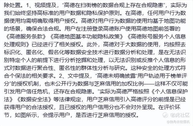 这个侵权投诉也算是高德首次回应这个问题,概括起来对用户有价值的信息有几点:用户芝麻信用引入高德评分的前提是已经获得用户的合法授权;高德对大数据的使用,按照去标识化、匿名化、假名化等数据安全技术进行数据分析和处理,也就是不用担心个人信息被披露出来(其实这个点倒基本没什么人担心)。