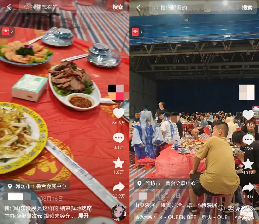 与此同时,河南焦作一家主办租借养老院700-800平的展厅办展,非节假日都能卖到1000多张票。山东潍坊的SWG漫展更是拥有8000平场地的施展空间,同样是接待300多人,主办方老蔡已经安排上了餐标水平过硬的「流水席」,票价只需80。一名游客在抖音上晒出漫展现场「吃席」的视频点赞超过56万,评论区满是羡慕的声音。