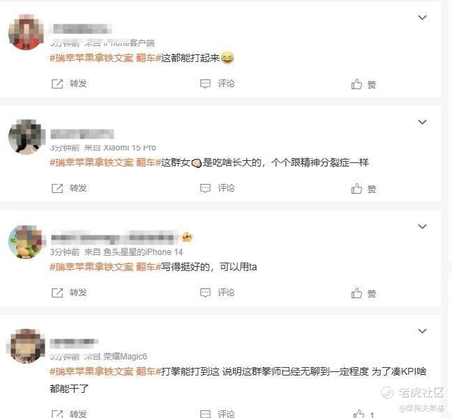 比如有人表示不能理解,某个群体为何会这么敏感:“我不行了,有点过分解读了吧,就是很正常很唯美的文案吧 到底在扯啥呢”“这群女拳是吃啥长大的,个个跟精神分裂症一样”“打拳能打到这,说明这群拳师已经无聊到一定程度,为了凑KPI啥都能干了 ”
