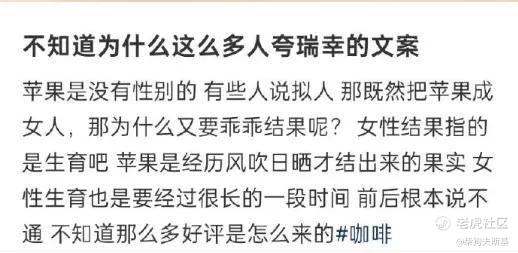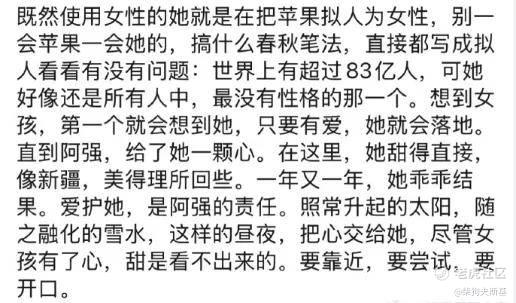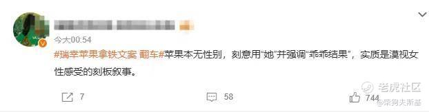 类似的还有:“苹果本无性别,刻意用“她”并强调“乖乖结果”,实质是漠视女性感受的刻板叙事。 ”