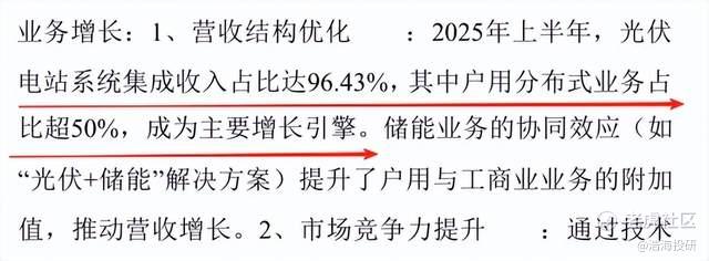 在营收结构上,2025年上半年,光伏电站系统集成收入占比达96.43%,其中户用分布式业务占比超50%,成为主要增长引擎。