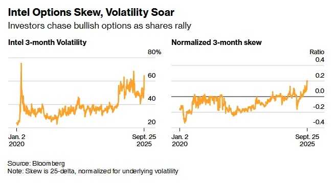数据显示,英特尔三个月期权的隐含波动率本周飙升至自今年4月初因关税引发美股抛售以来的最高水平,但投资者并非在寻求对冲下跌风险,而是买入能从进一步上涨中获利的看涨期权。