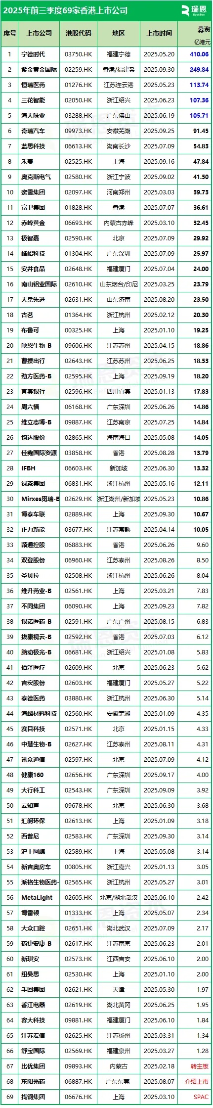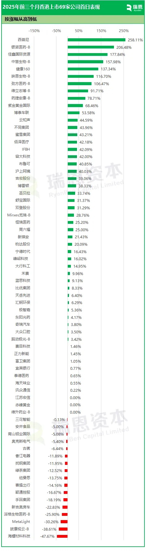 2025年前三季度香港69家上市首日表现