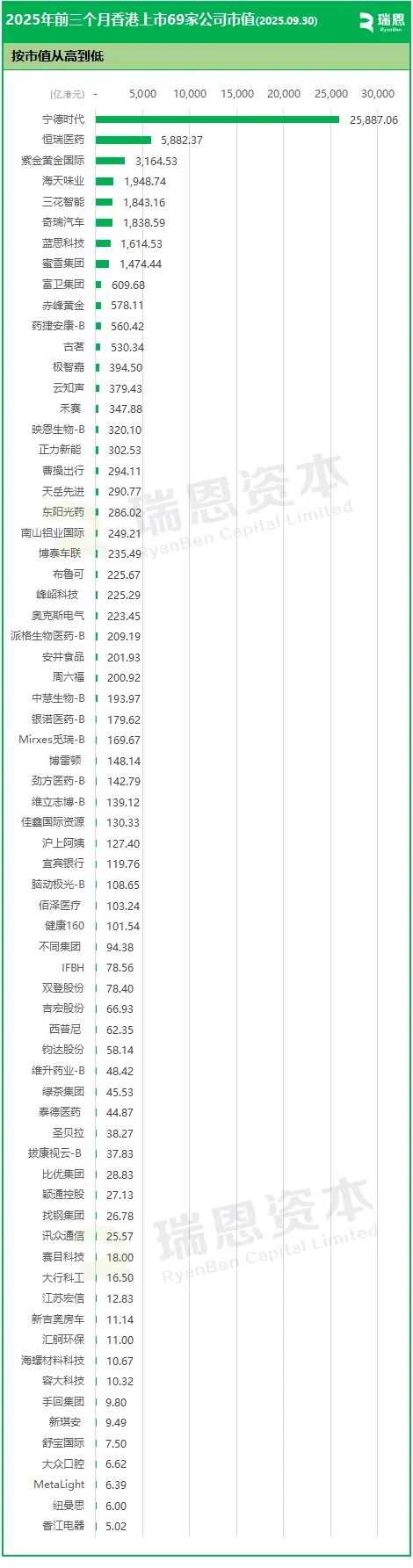 2025年前三季度香港69家上市公司市值(2025.09.30)