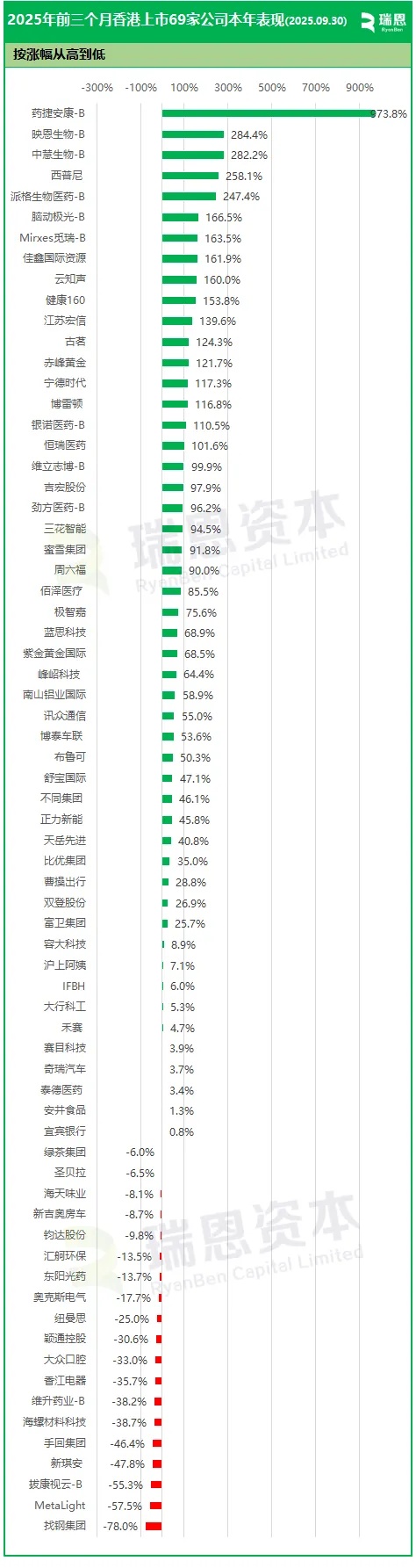 2025年前三季度香港69家上市累计涨幅(2025.09.30)